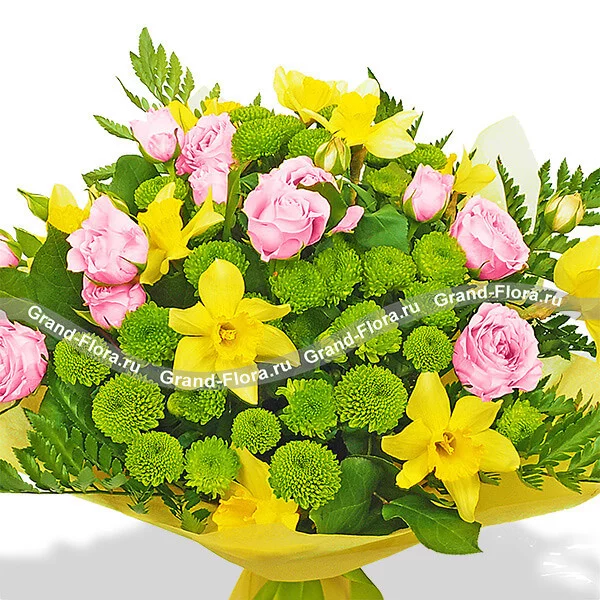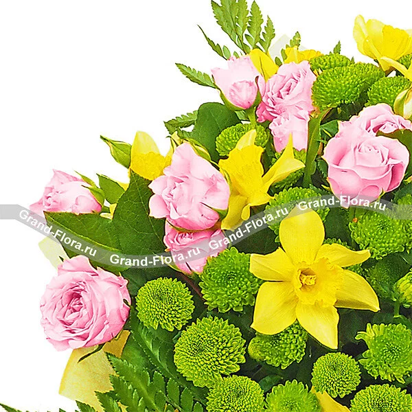 ДЕЛЮКС: роза кустовая розовая - 5 шт, хризантема кустовая зеленая (сантини) - 5 шт, нарциссы - 7 шт, декоративная зелень, фетр желтый.